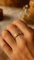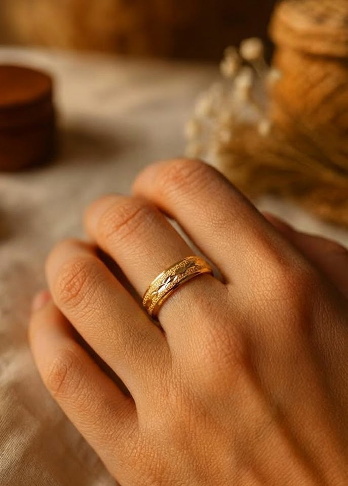 A timeless 22K gold band with a soft, warm glow and elegant texture. The center features a delicate satin finish, framed by shimmering diamond cut detailing that catches the light with every movement. Smooth on the inside for comfortable everyday wear, it is the kind of ring that feels classic on its own and beautiful stacked with others.