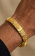 This 22k gold men’s bracelet is designed with solid rectangular links, each engraved with Sikh Khanda motifs that add cultural meaning and identity. The contrast between polished surfaces and textured detailing creates depth while keeping the look refined and balanced. Finished with a secure clasp and a comfortable fit, it’s a statement piece that blends tradition with everyday wearability.