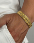This 22k gold men’s bracelet features a bold, patterned design built from tightly set links that create a strong, continuous flow across the wrist. Each section is detailed with sharp angles and subtle texture, giving the bracelet depth and character without feeling overly ornate. The width adds presence, making it an ideal piece for someone who prefers solid, noticeable gold jewelry. Finished with a secure clasp, it’s well suited for both daily wear and special occasions, offering a confident look that feels timeless rather than trendy.