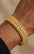 This 22K gold men’s bracelet features a tightly linked, rounded pattern that creates a smooth, fluid look across the wrist. Each polished link reflects light evenly, giving the bracelet a rich depth and a substantial feel without appearing bulky. The design balances traditional craftsmanship with a clean, wearable profile, making it suitable for everyday wear or special occasions.
