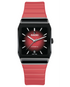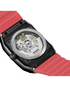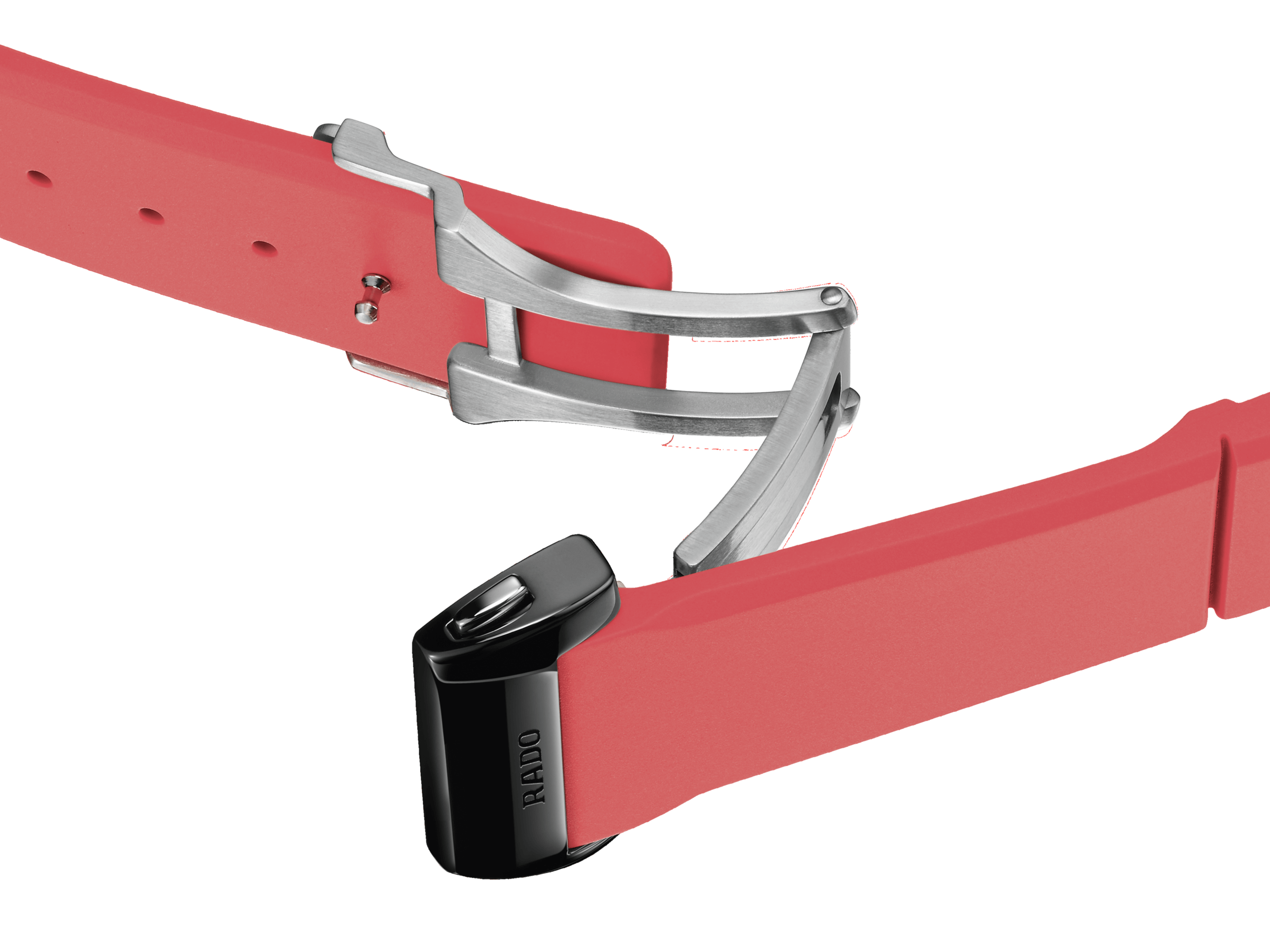 Since its debut in 1983, the Rado Anatom has stood as a symbol of groundbreaking design and ultimate comfort. Its signature feature is the cylindrical metallized sapphire crystal, symmetrically bevelled on both sides, with the bevel flowing seamlessly into the polished high-tech ceramic case, continuing through the polished stainless steel end links, and ultimately merging into the grapefruit red rubber strap. This unified design is secured by a brushed stainless steel three-fold clasp and topped with a polished high-tech ceramic cover.