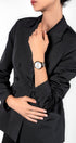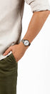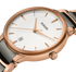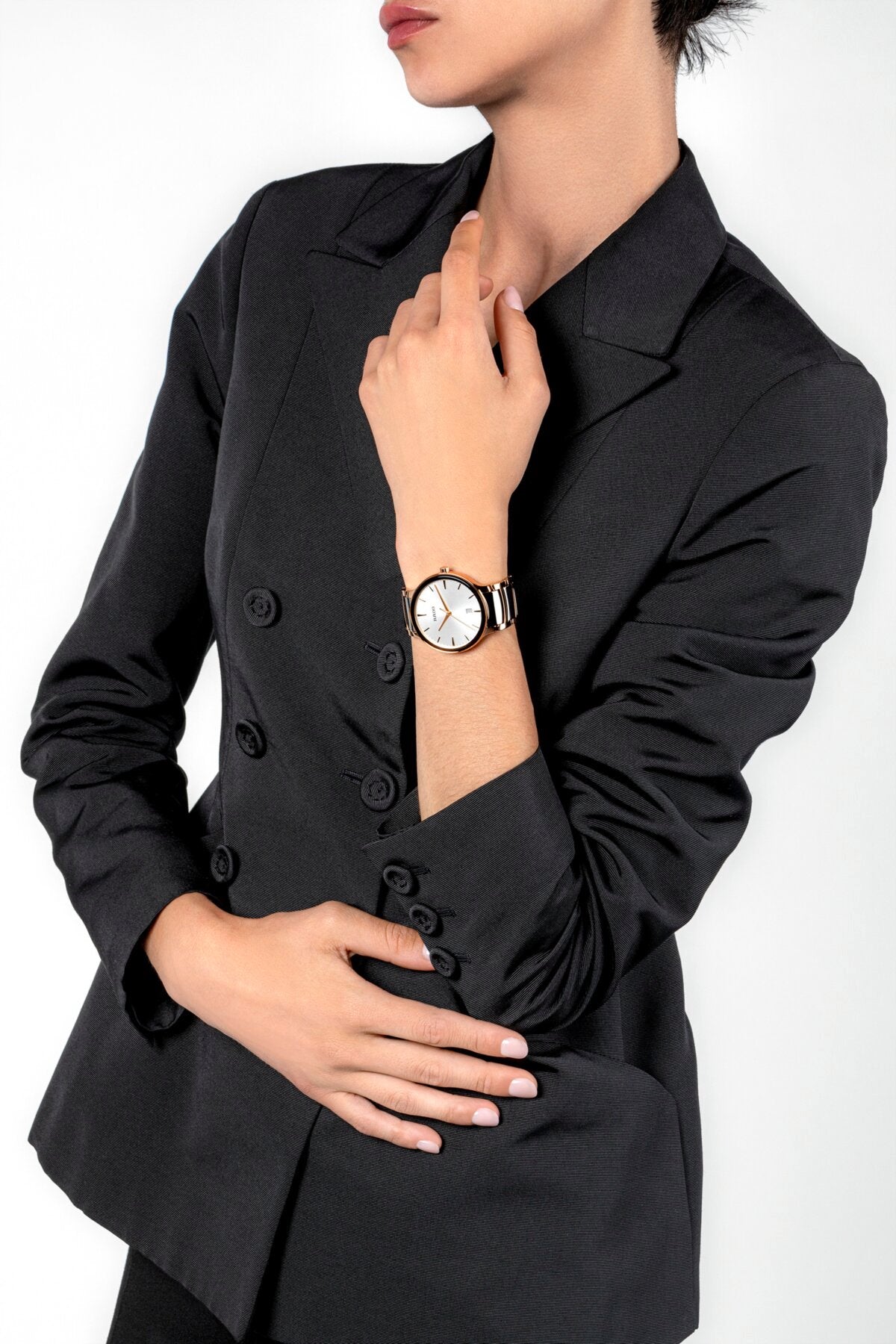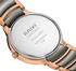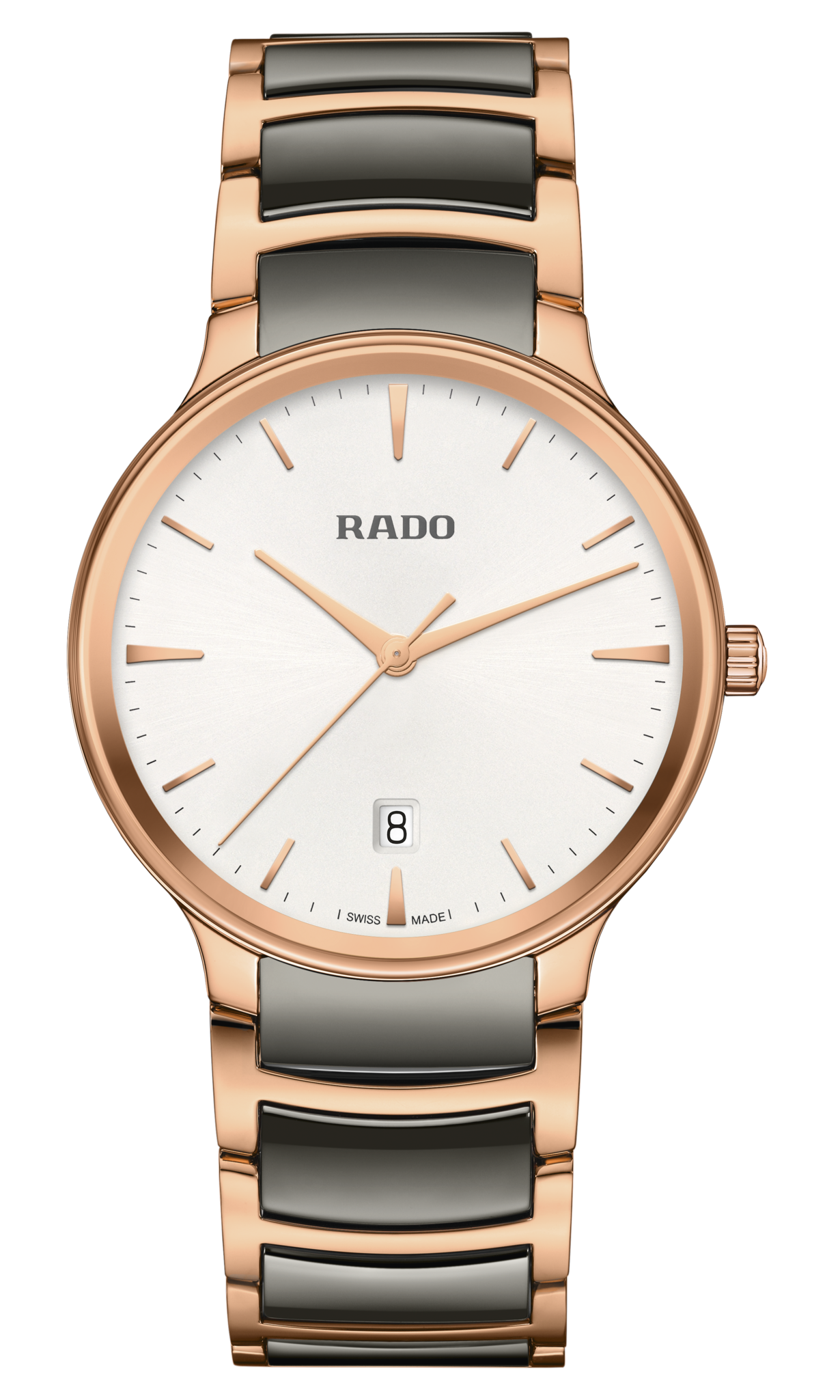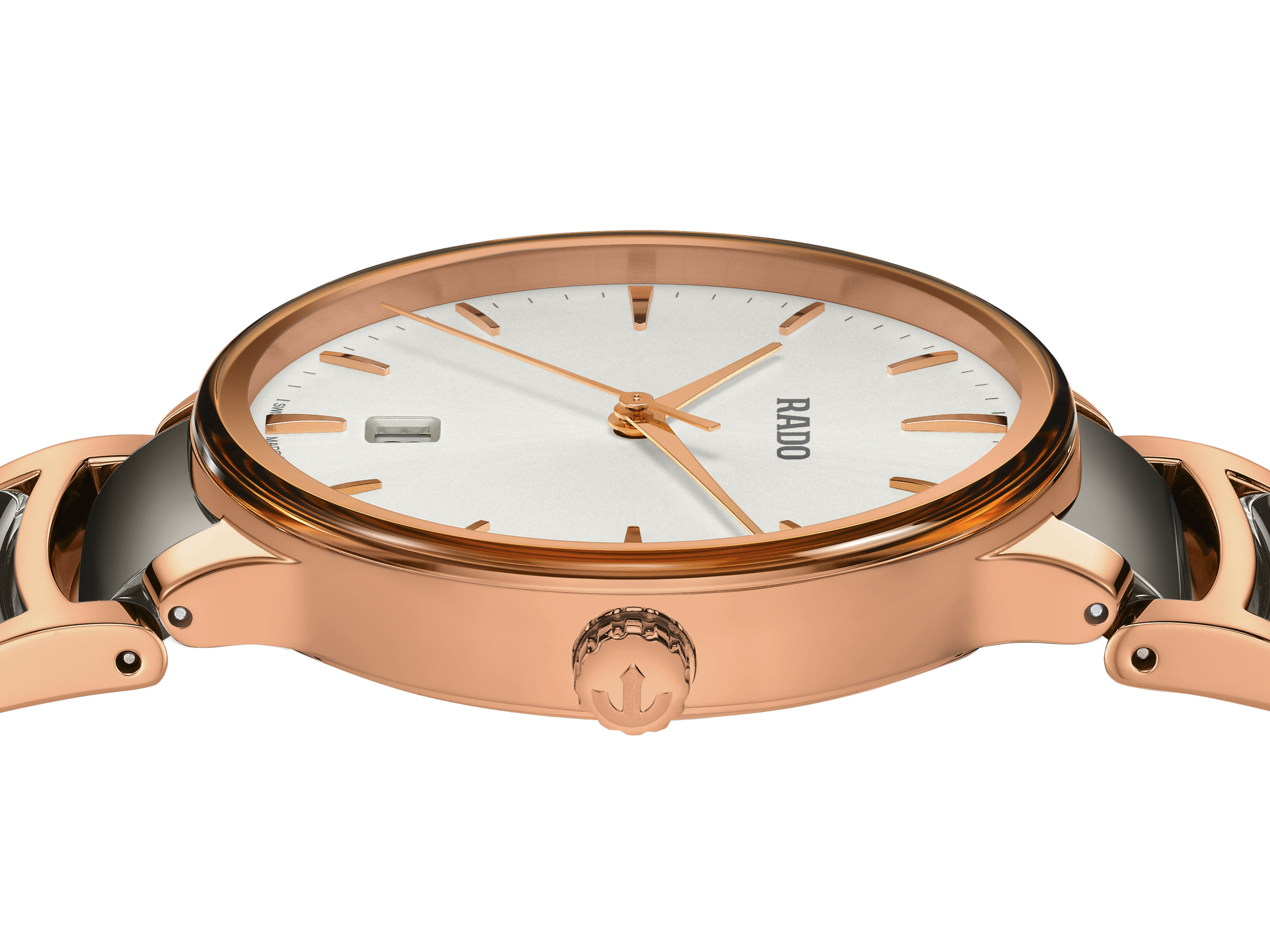 The classic Centrix Quartz has been reworked not only technically, but also aesthetically. The modified model has a rounded sapphire crystal that extends all the way to the edge and a curved case blending with the curved crystal edge. The overall appearance of this iconic timepiece is completed with adjusted case lugs and a bracelet made of polished rose gold-coloured PVD-coated stainless steel with plasma high-tech ceramic middle links.