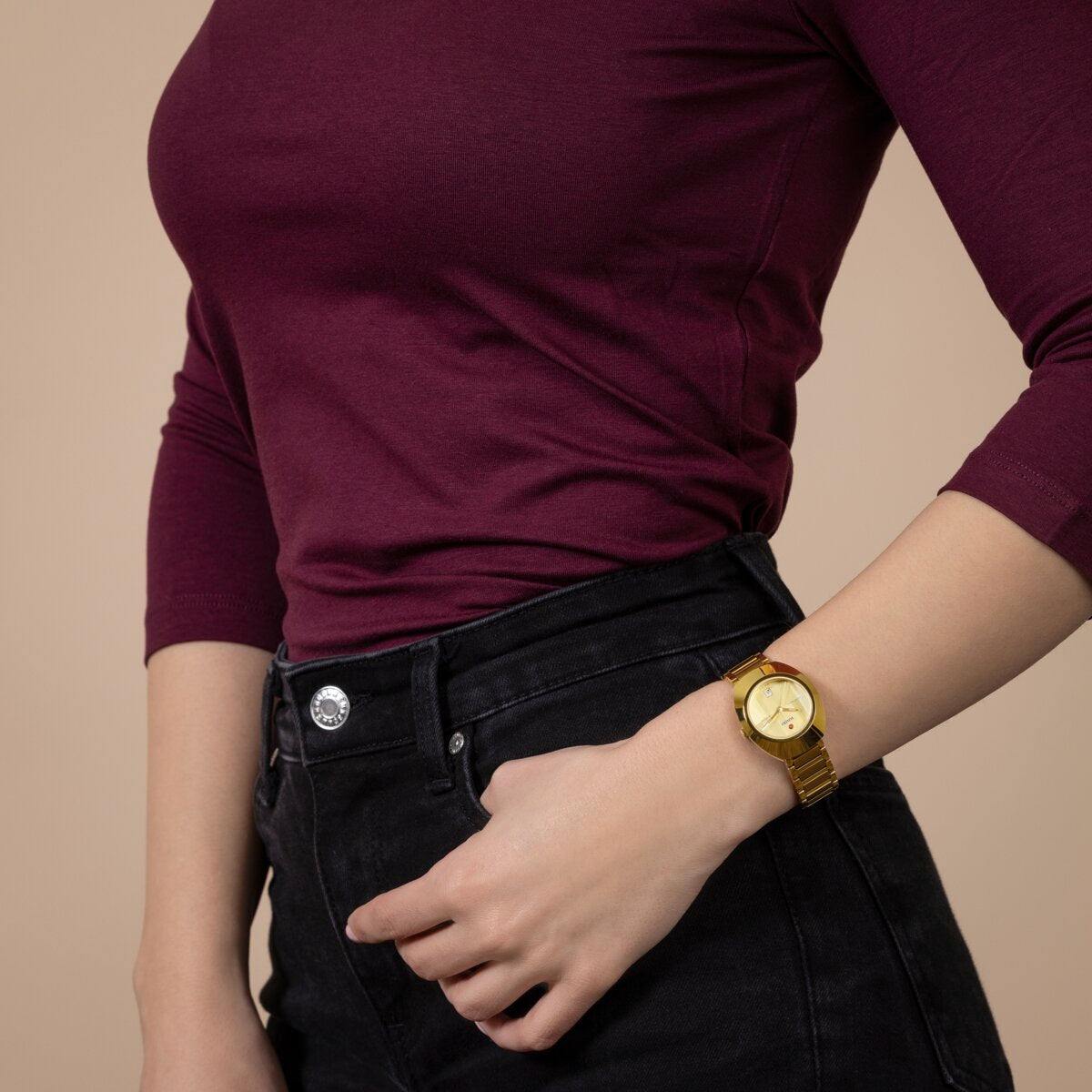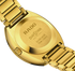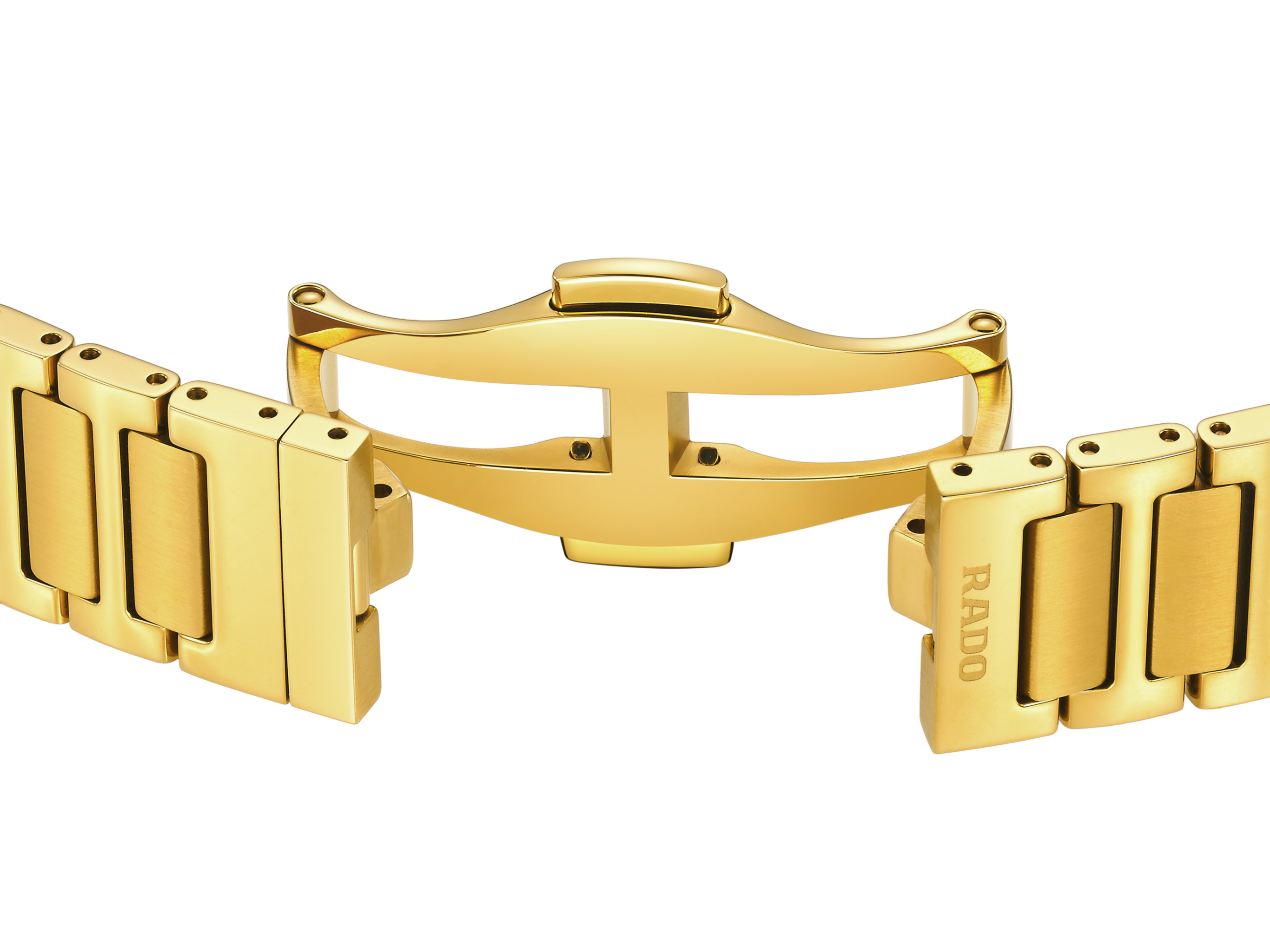 The Diastar Original, a hallmark of Swiss craftsmanship and avant-garde innovation, is boldly remastered by the globally renowned industrial designer Tej Chauhan. The 38 mm case, crowned by a polished yellow gold-coloured PVD coated Ceramos™ bezel, merges effortlessly with a polished yellow gold-coloured PVD coated stainless-steel middle case, offering water resistance up to 10 bar (100 metres).