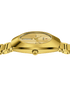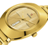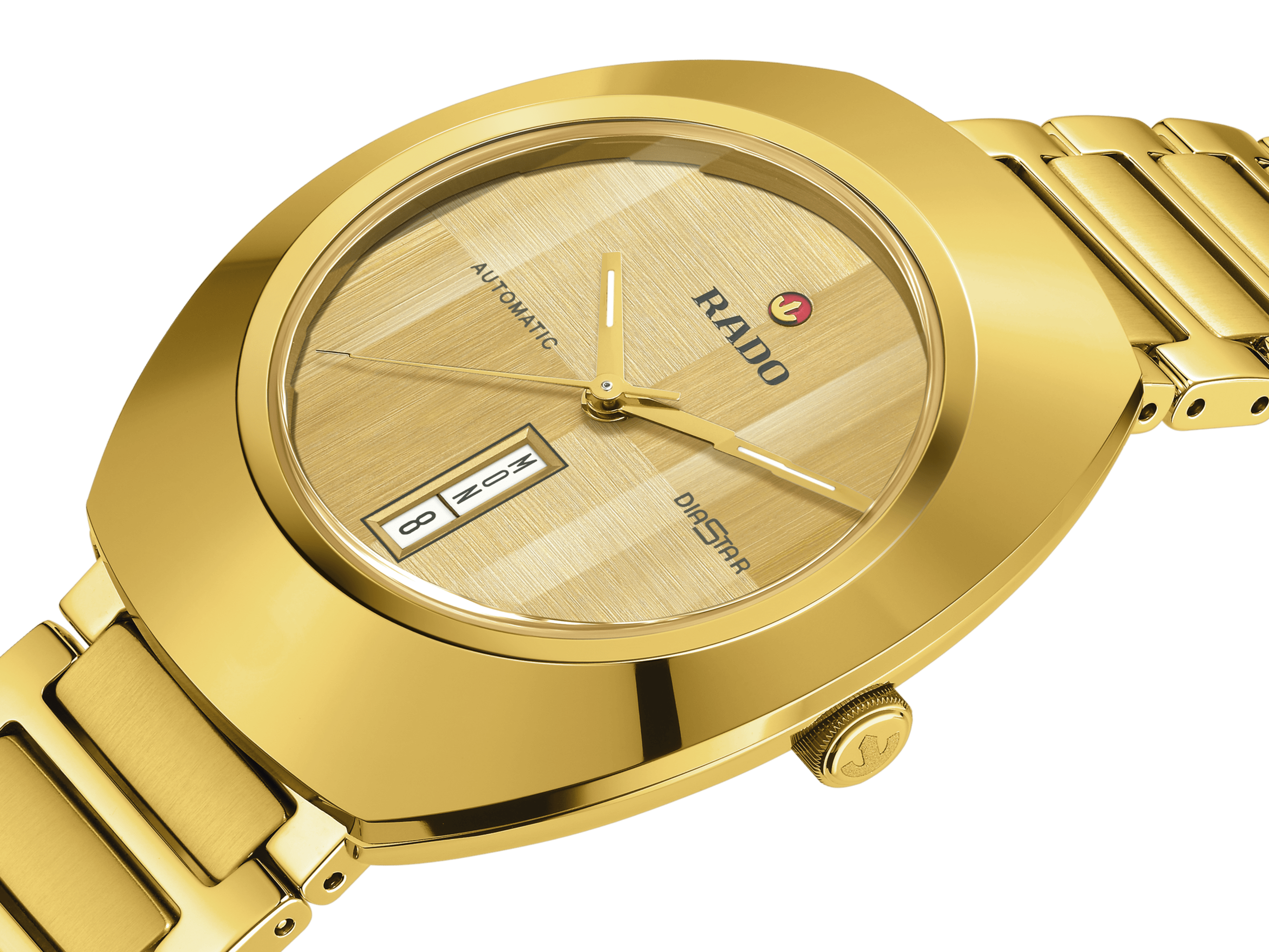 The unique DiaStar Original has a diameter of 38 mm and is water resistant down to 100 m. Framed by an ultra-shiny yellow gold-coloured Ceramos™ coiffe with polished angles and detailing set over a matching, yellow gold-coloured PVD coated stainless-steel case, this beautiful watch is rounded off with a parallel-stripe-faceted sapphire crystal. Specifications include a gold brushed dial with two directions, yellow gold-coloured hands with white Super-LumiNova®, and a white day date display. The Rado R764 automatic movement offers 80 hours of power reserve, with an antimagnetic Nivachron™ balance spring. The bracelet is made of yellow gold PVD coated polished and brushed stainless steel.