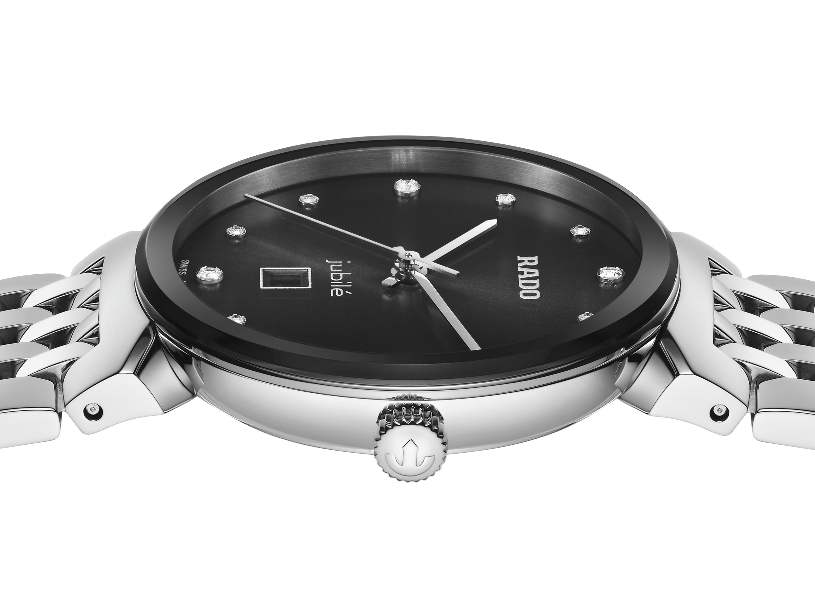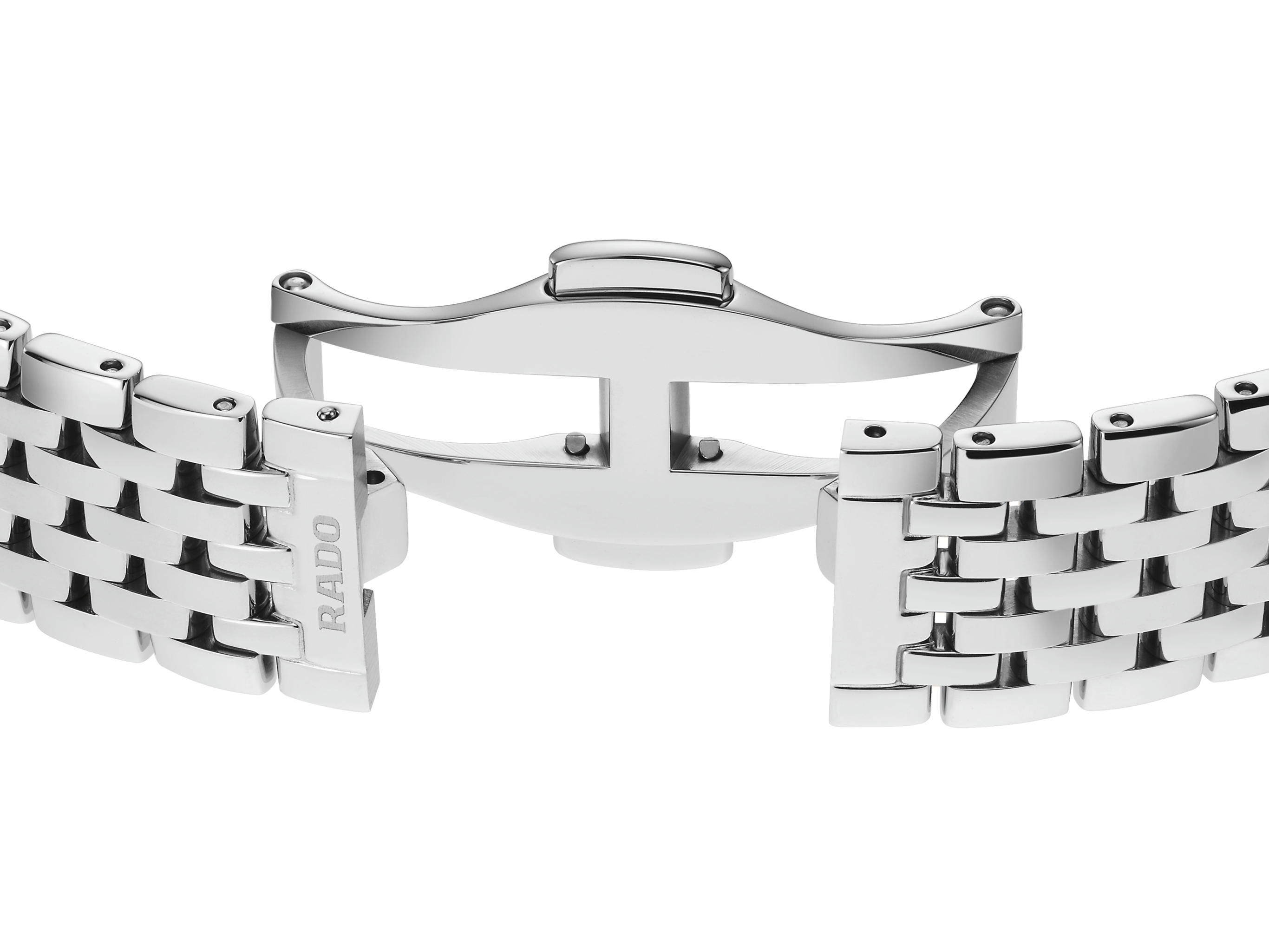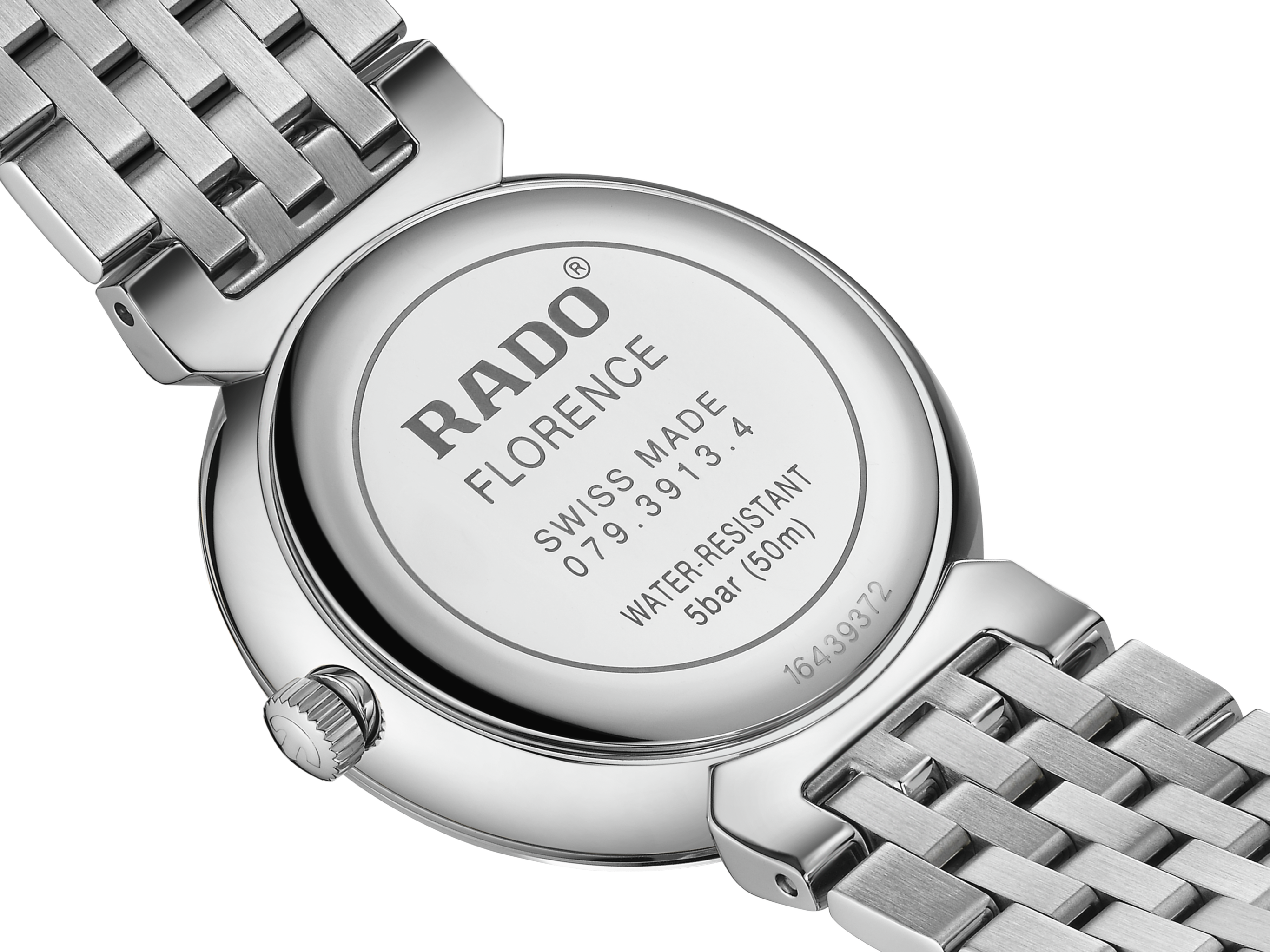 The harmonious design of the Rado Florence Classic calls to mind the elegant domes and towers of the city from which the collection takes its name. The 30 mm watch has an edge-to-edge-bevelled, curved sapphire crystal. The case, bezel, crown and bracelet are made of polished stainless steel.