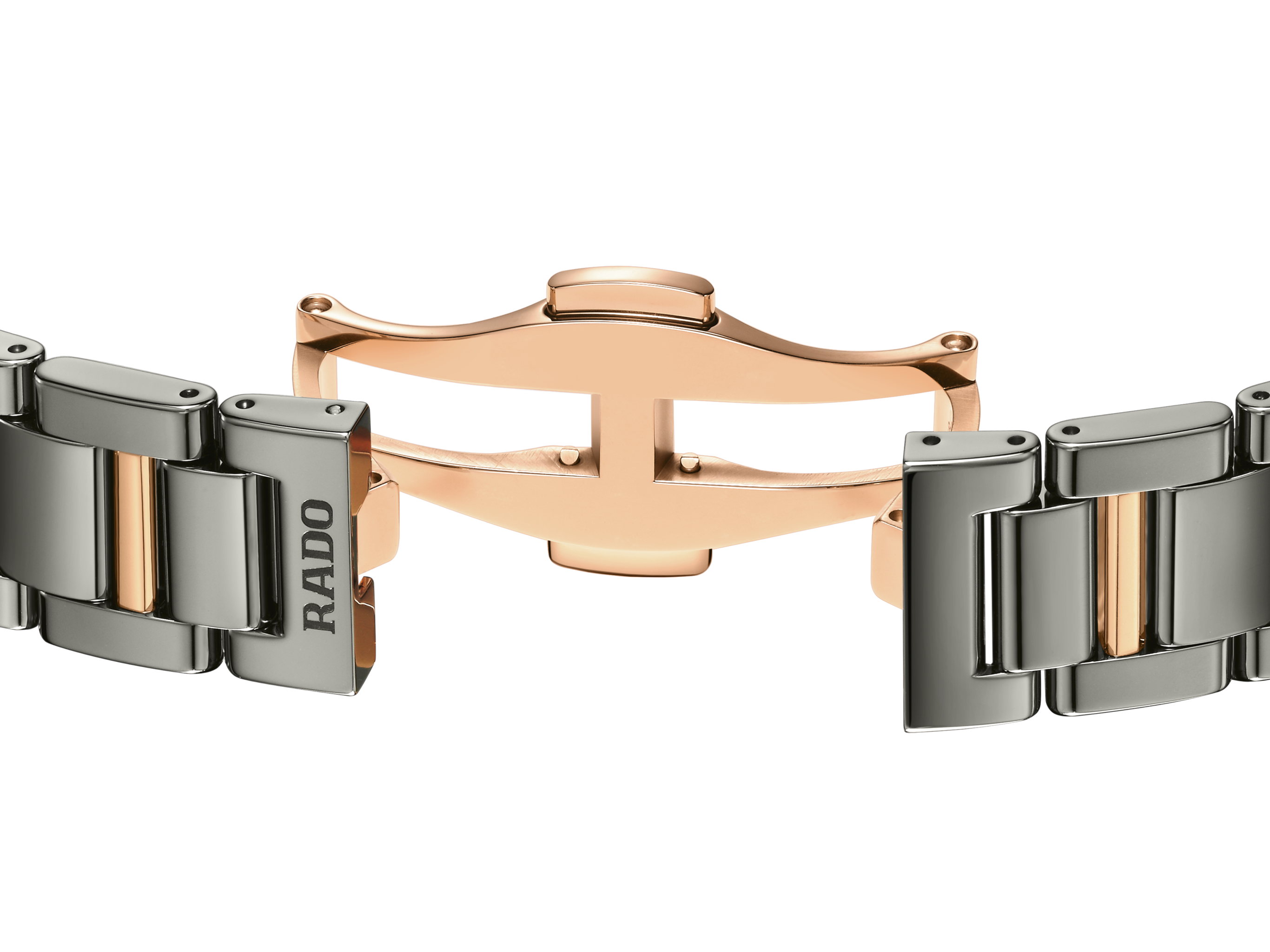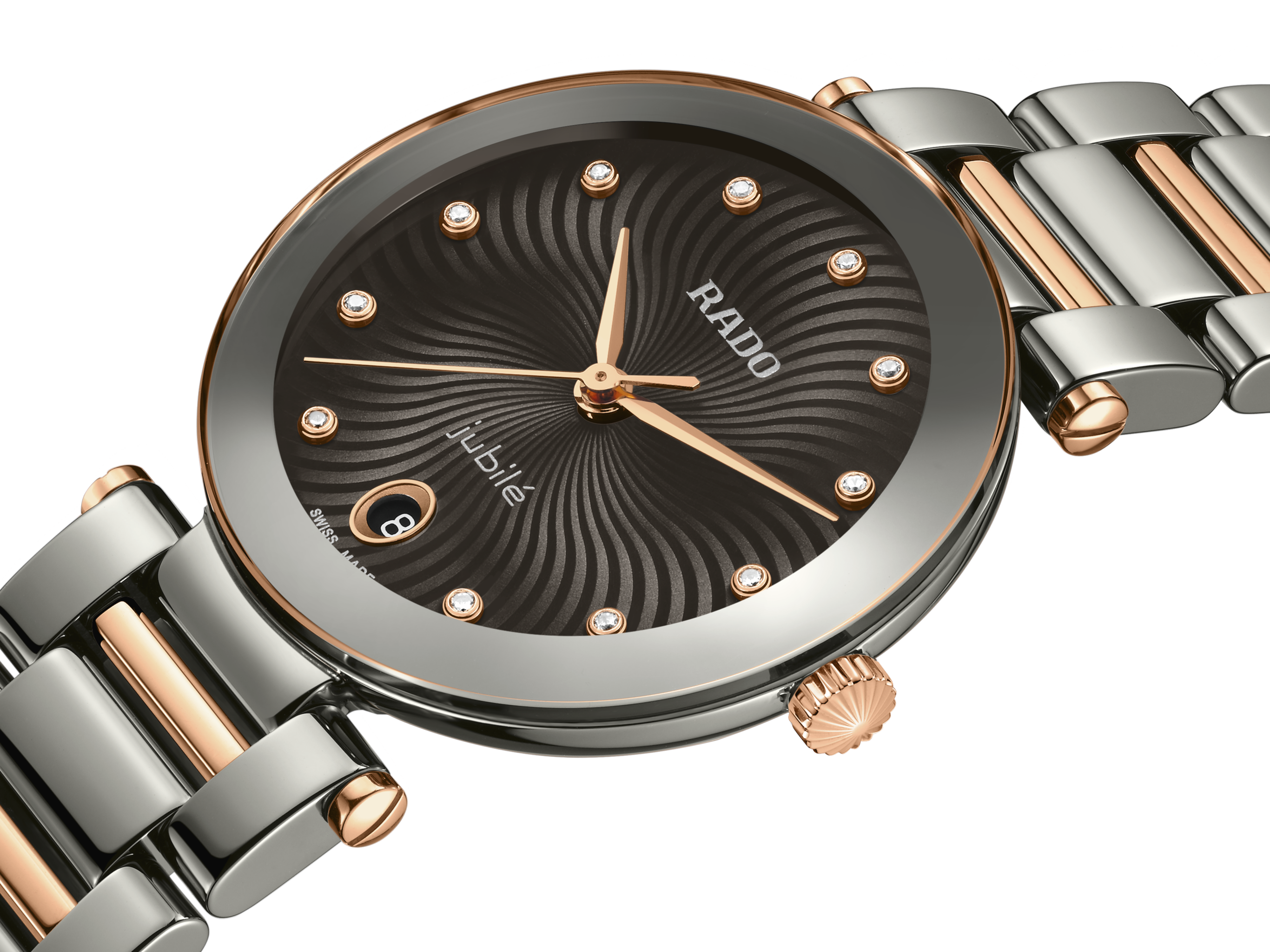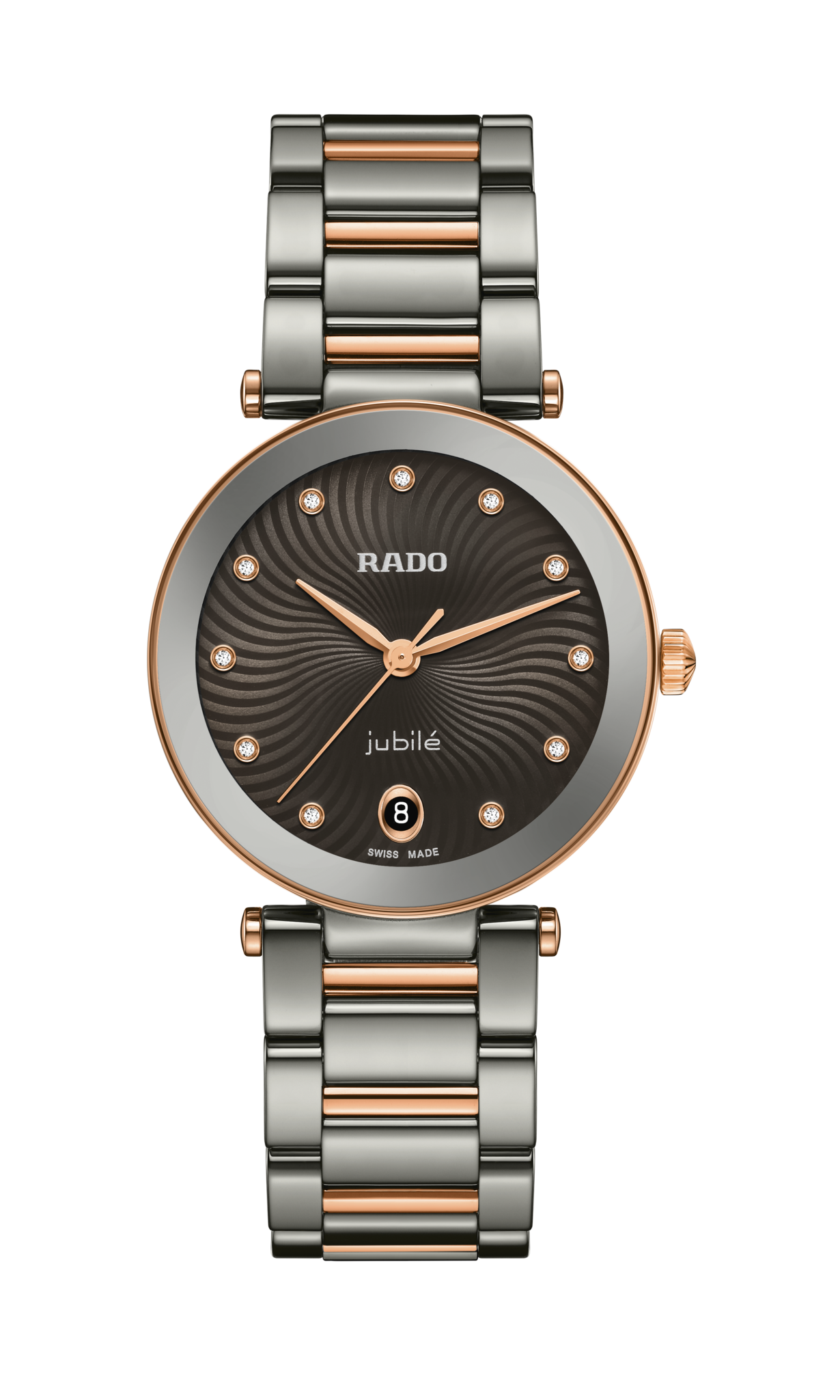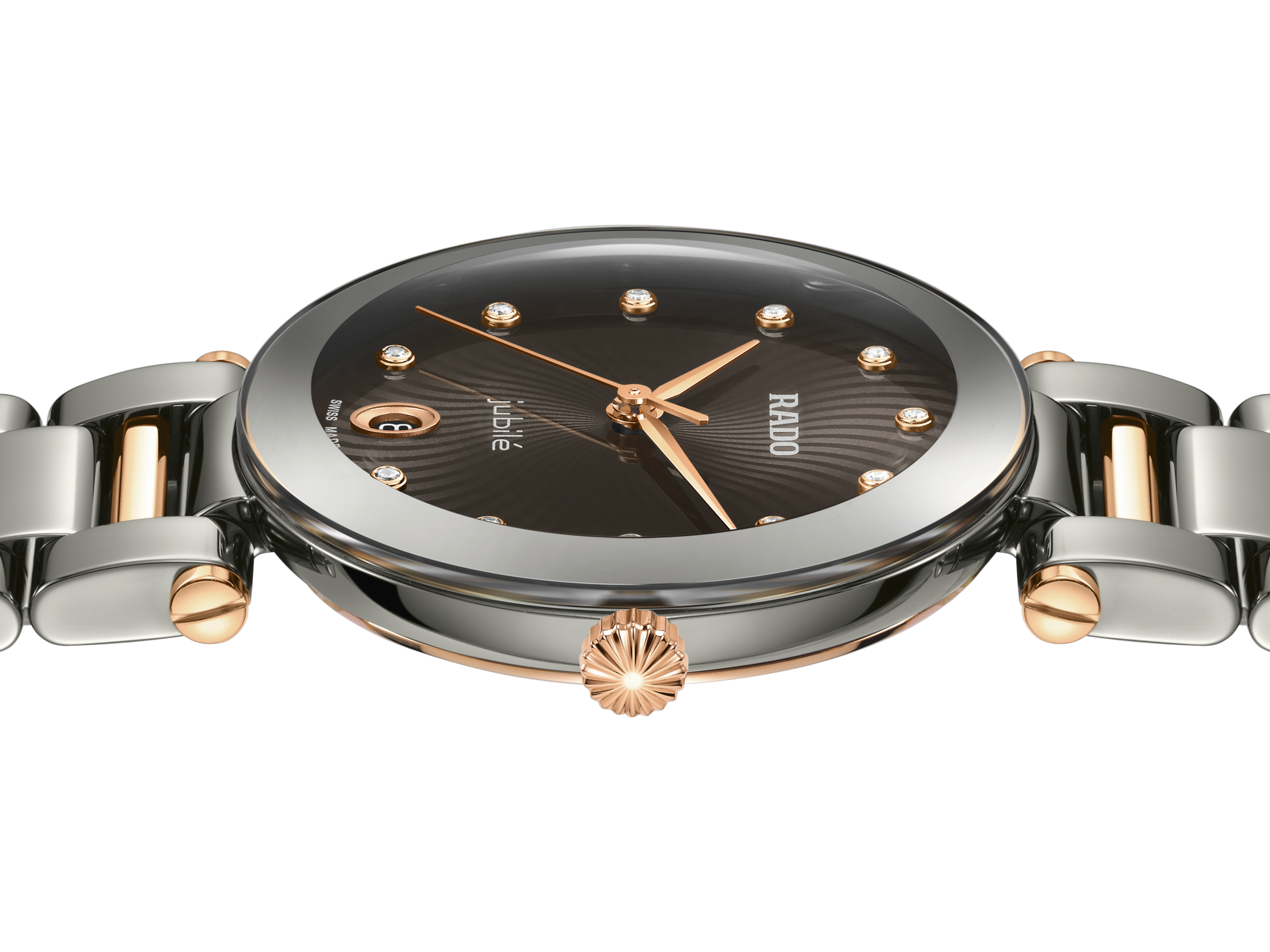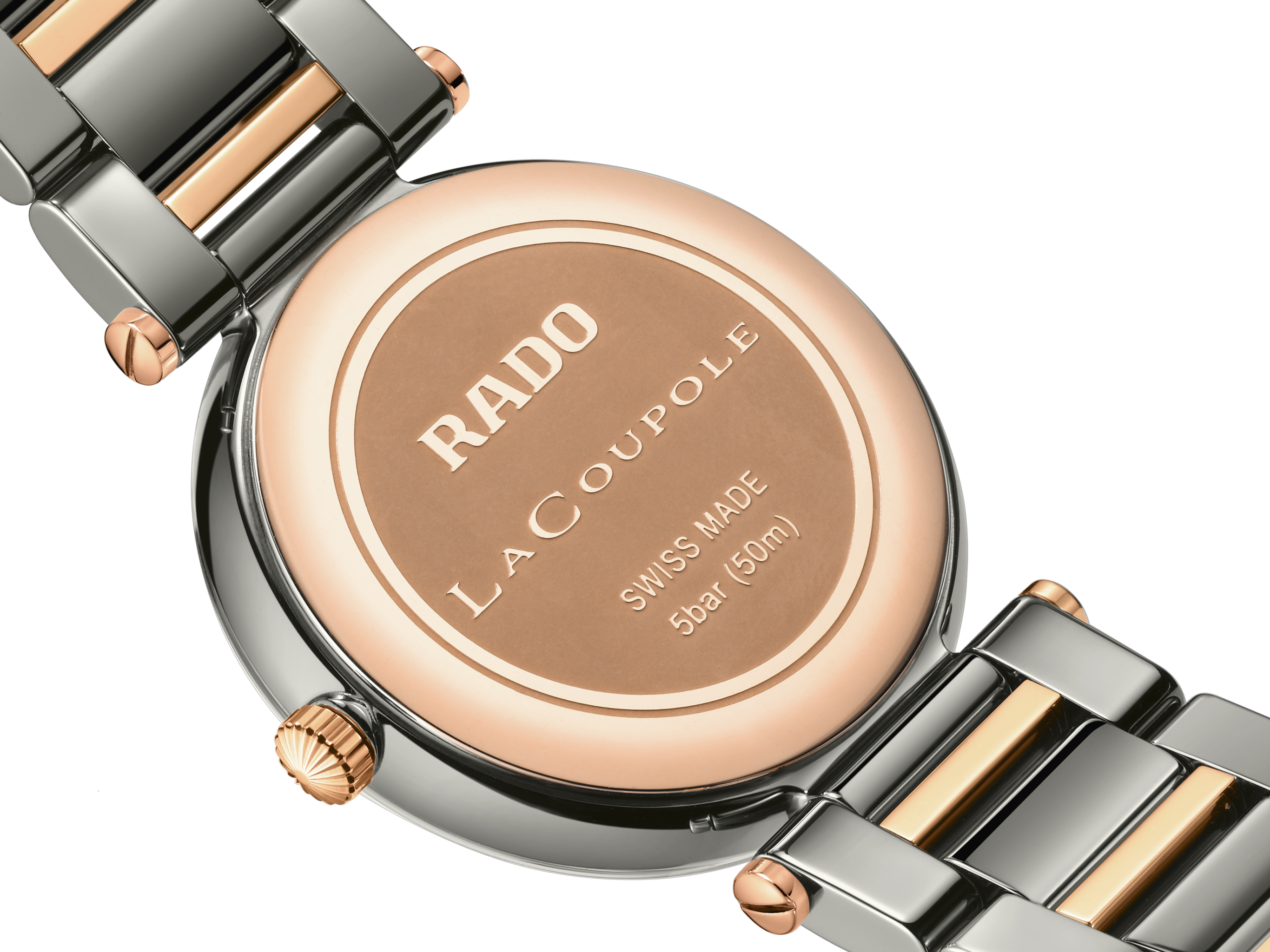 LaCoupole stands as a tribute to the icons of yesterday, redefined for today’s sophisticated wearer. An expression of refined glamour, engineered with the precision and innovation only Rado can offer. Its 31 mm monobloc case in polished plasma high-tech ceramic is crowned by a domed sapphire crystal, elevated by a grey & rose gold coloured metallised border.