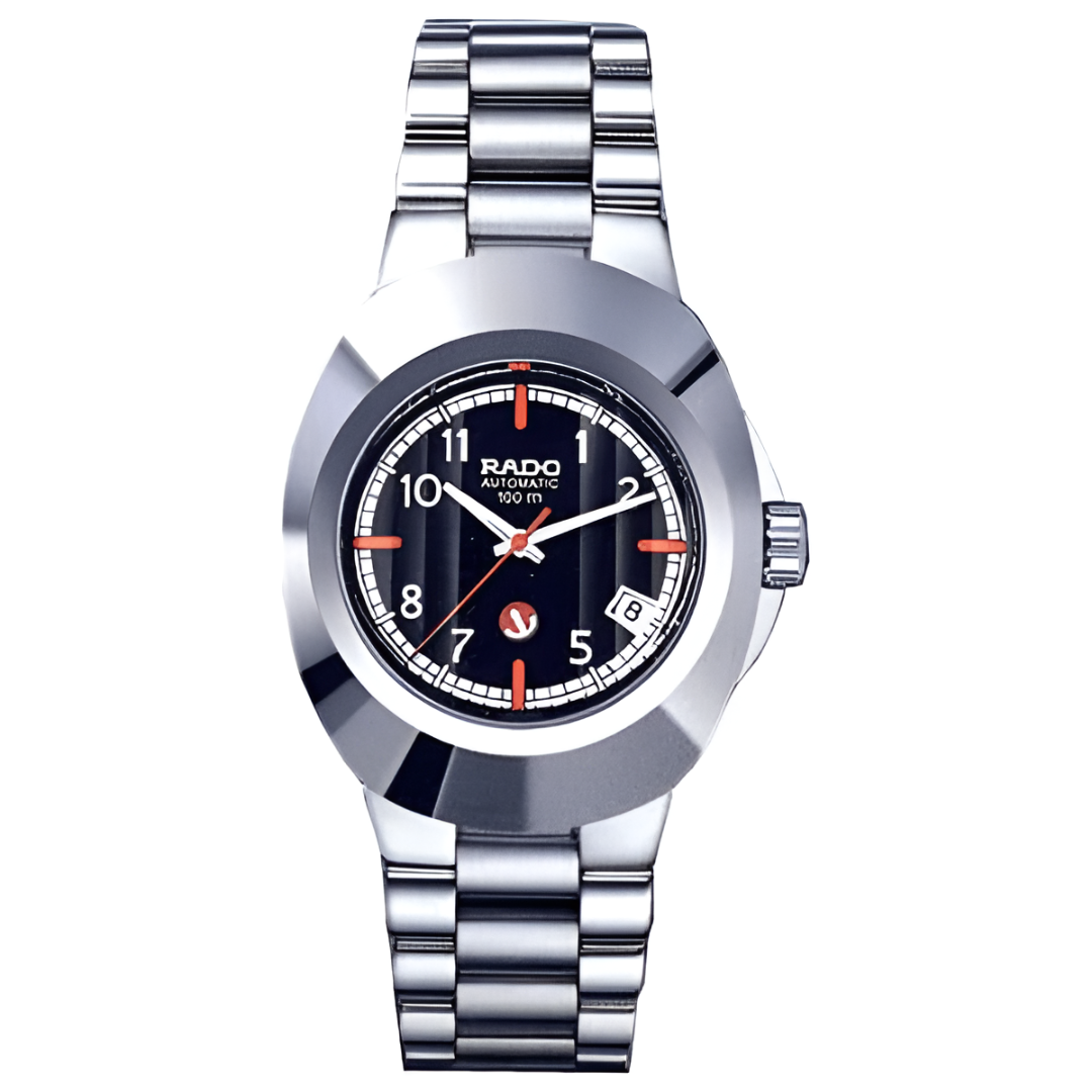 The Rado Original R12636153 is a men's automatic watch that combines strength and sophistication. Featuring a 38.5 mm oval stainless steel case with a matching silver-tone bracelet, this timepiece is built for durability and style. The scratch-resistant sapphire crystal protects a bold black dial with a date display positioned between 4 and 5 o'clock. Water-resistant up to 100 meters (330 feet) and equipped with a screw-down crown, the Rado Original ensures reliability in everyday wear. A true Swiss-made automatic watch, it balances timeless design with modern functionality.