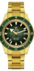 This polished yellow gold coloured Captain Cook has a water resistance to 30 bar. The case and the turning bezel are made of stainless steel, while the polished green high-tech ceramic bezel insert is engraved with yellow gold coloured metallised numbers and markers. The hands and indexes are coated with white SuperLuminova® and give contrast to the green to black gradient lacquered dial. Inside, the Rado R763 automatic movement exceeds standard accuracy test requirements by a full five points and offers 80 hours of power reserve. The EasyClip system allows you to change the straps quickly and easily, customising your watch and personalising your style.