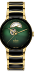Discover the perfect harmony of innovation and aesthetics with the Rado Centrix Automatic Open Heart. At the heart of this masterpiece beats the Automatic Rado calibre R734 movement, producing impeccable precision and reliability. With an impressive 80-hour power reserve, this watch ensures uninterrupted performance. The antimagnetic Nivachron™ hairspring and adjustment in five positions further enhance its accuracy. Encased in a polished yellow gold coloured stainless steel case, measuring a refined 39.5 mm, the Centrix Automatic Open Heart showcases meticulous craftsmanship.