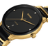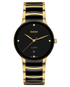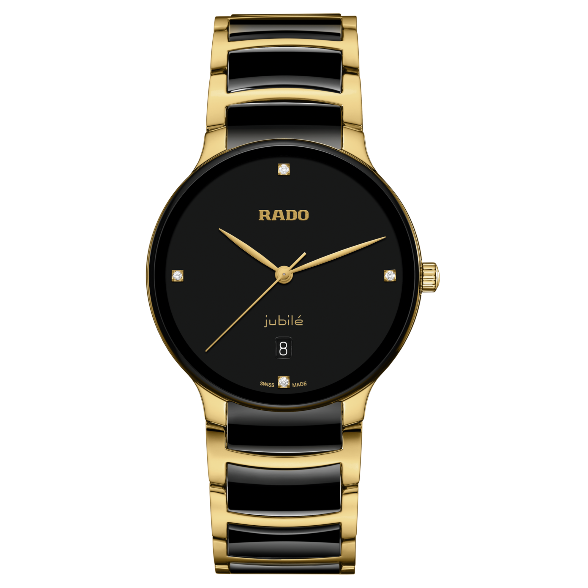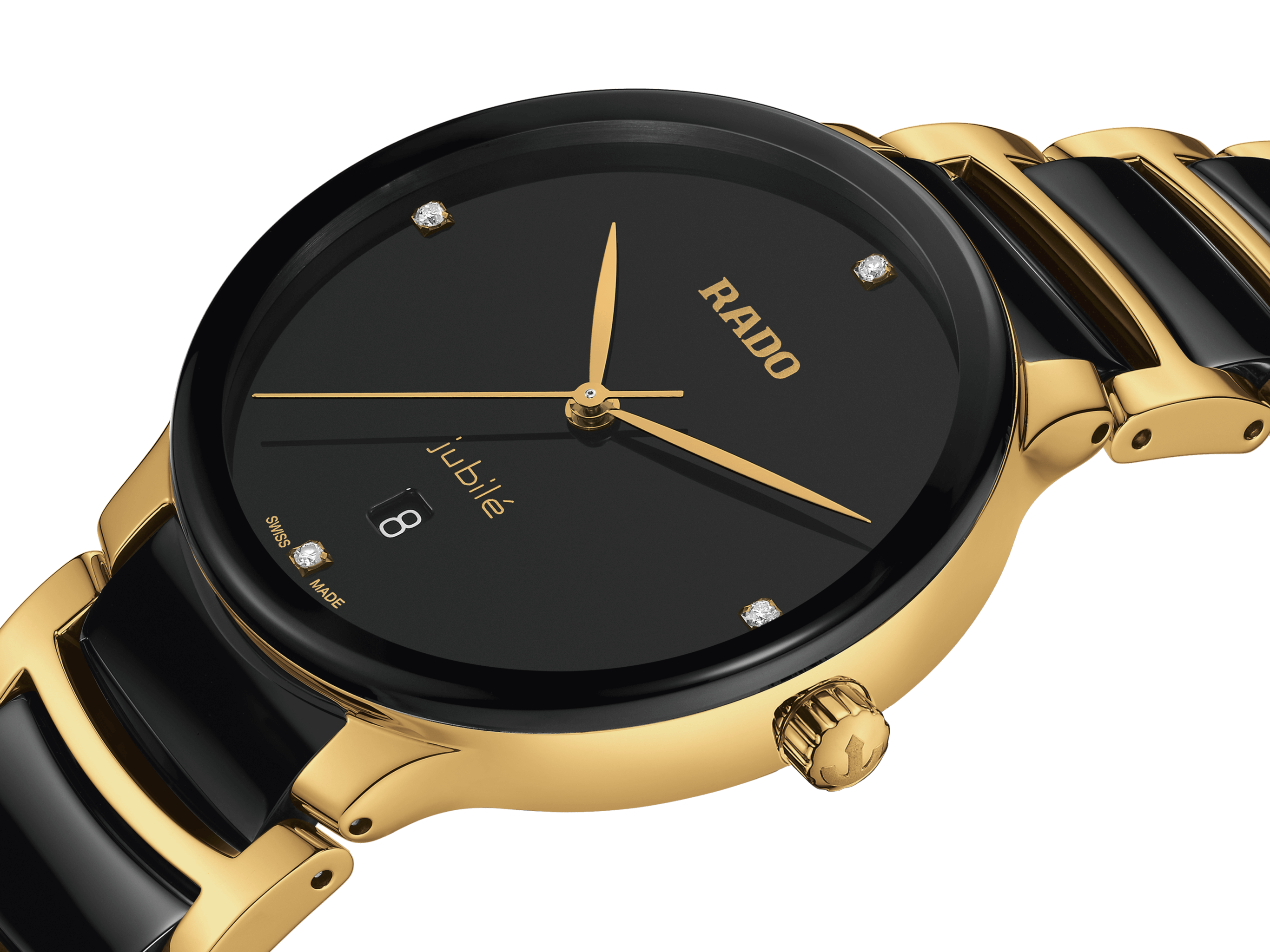 The classic Centrix Quartz Diamonds watch has been reworked not only technically, but also aesthetically. The modified model has a rounded sapphire crystal that extends all the way to the edge, as well as a curved case blending with the curved crystal edge. The overall appearance of this iconic timepiece is completed with adjusted case lugs and a bracelet made of polished yellow gold-coloured PVD-coated stainless steel with black high-tech ceramic middle links.