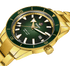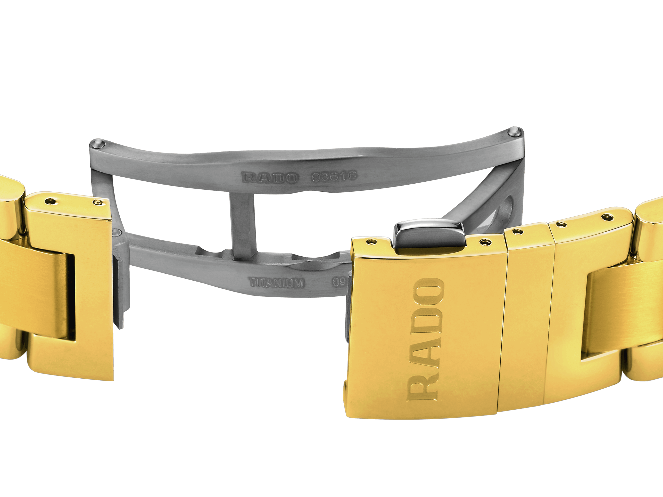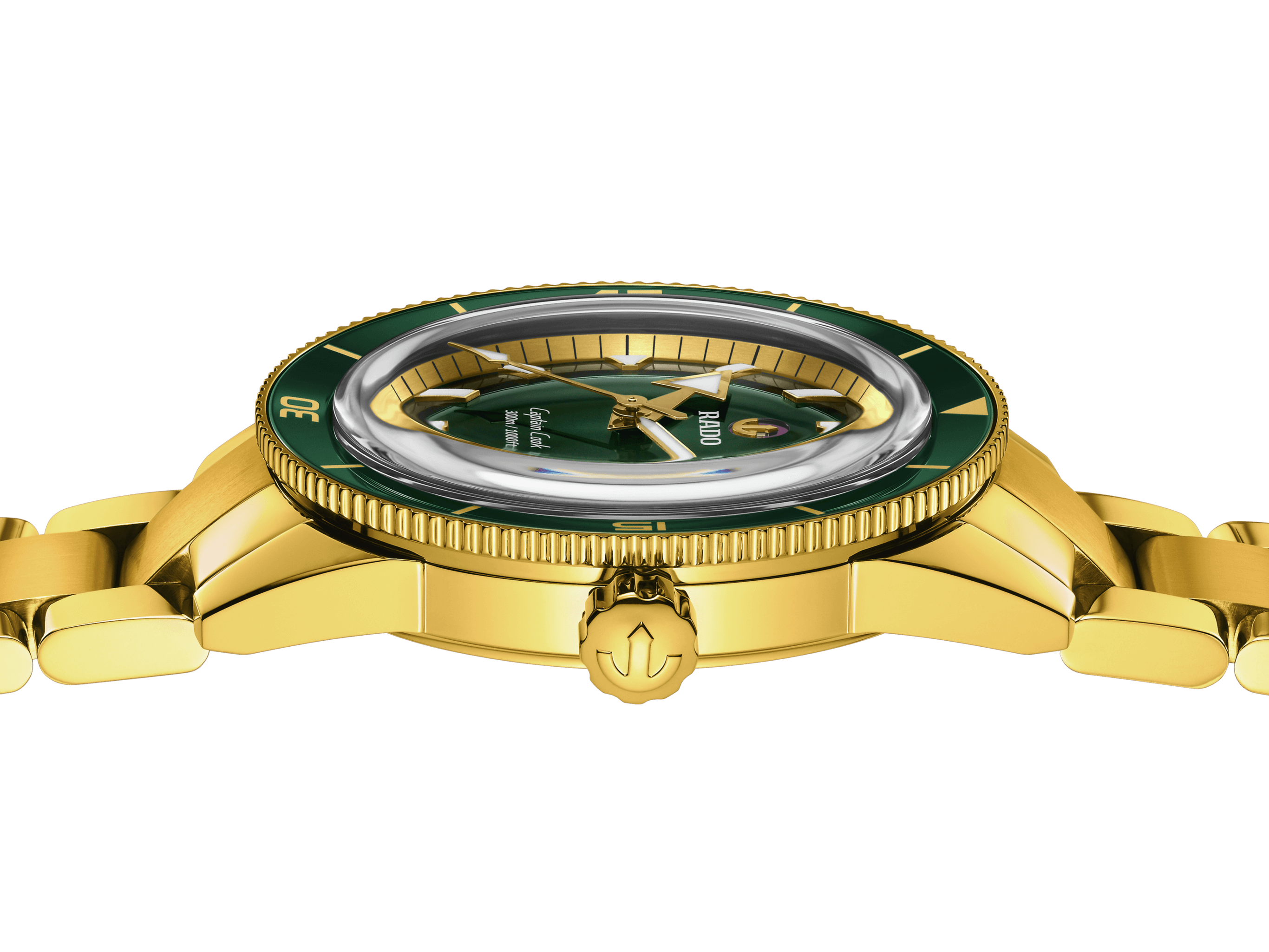 This polished yellow gold coloured Captain Cook has a water resistance to 30 bar. The case and the turning bezel are made of stainless steel, while the polished green high-tech ceramic bezel insert is engraved with yellow gold coloured metallised numbers and markers. The hands and indexes are coated with white SuperLuminova® and give contrast to the green to black gradient lacquered dial. Inside, the Rado R763 automatic movement exceeds standard accuracy test requirements by a full five points and offers 80 hours of power reserve. The EasyClip system allows you to change the straps quickly and easily, customising your watch and personalising your style.
