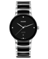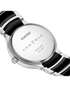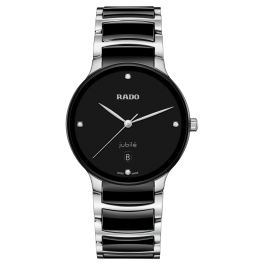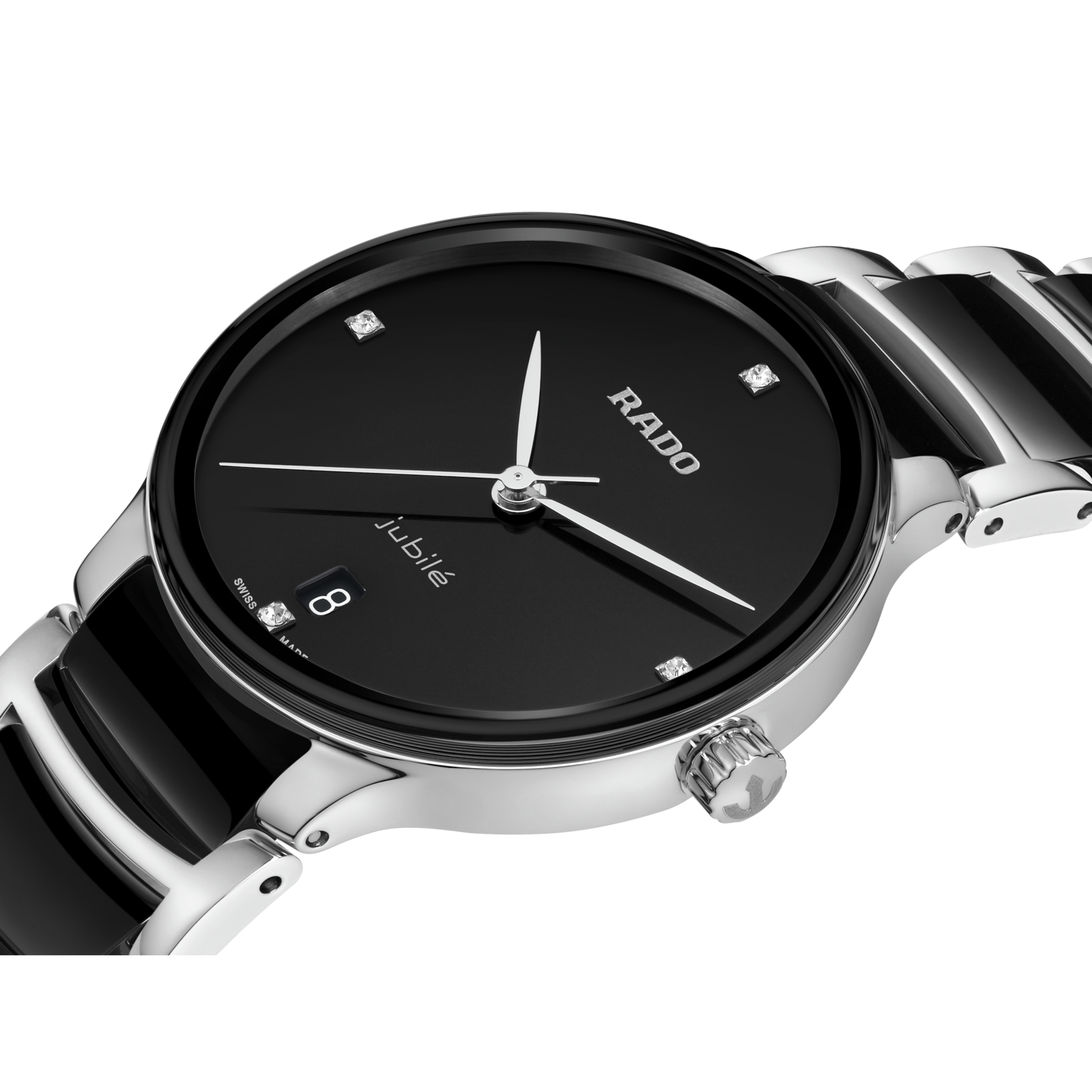 The classic Centrix Quartz Diamonds watch has been reworked not only technically, but also aesthetically. The modified model has a rounded sapphire crystal that extends all the way to the edge, as well as a curved case blending with the curved crystal edge. The adjusted case lugs and the bracelet made of polished stainless steel with black high-tech ceramic middle links complete the overall appearance of this iconic timepiece. The black lacquered dial with 4 diamonds, emphasised with the printed “jubilé” logo, matches perfectly with the rhodium-coloured hands. Thanks to the PreciDrive and HeavyDrive features in the calibre R073 quartz movement, the watch has greater accuracy and resistance to shocks. The watch is water-resistant down to 50 m.