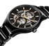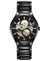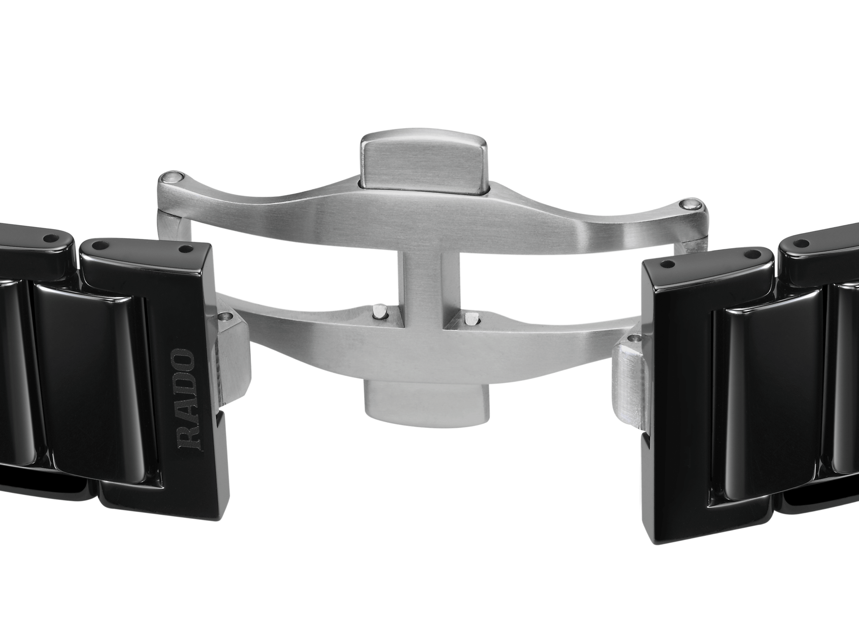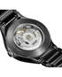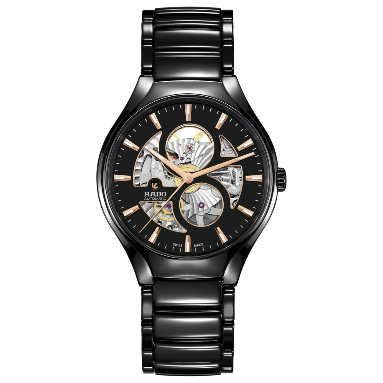 Experience the perfect blend of design excellence and material mastery with the Rado True Round Open Heart. This remarkable timepiece showcases a captivating open heart design, allowing you to admire the intricate movements of the automatic Rado caliber R734, a pure expression of the art of watchmaking. Fitted with an antimagnetic Nivachron™ hairspring, it delivers a power reserve of 80 hours. It has a polished black high-tech ceramic monobloc case and crown and a black PVD-coated titanium case whose sapphire crystal allows an unobstructed view of the movement. It features a black sunray dial with rose gold-colored bevels and a gray printed minute track.