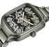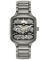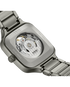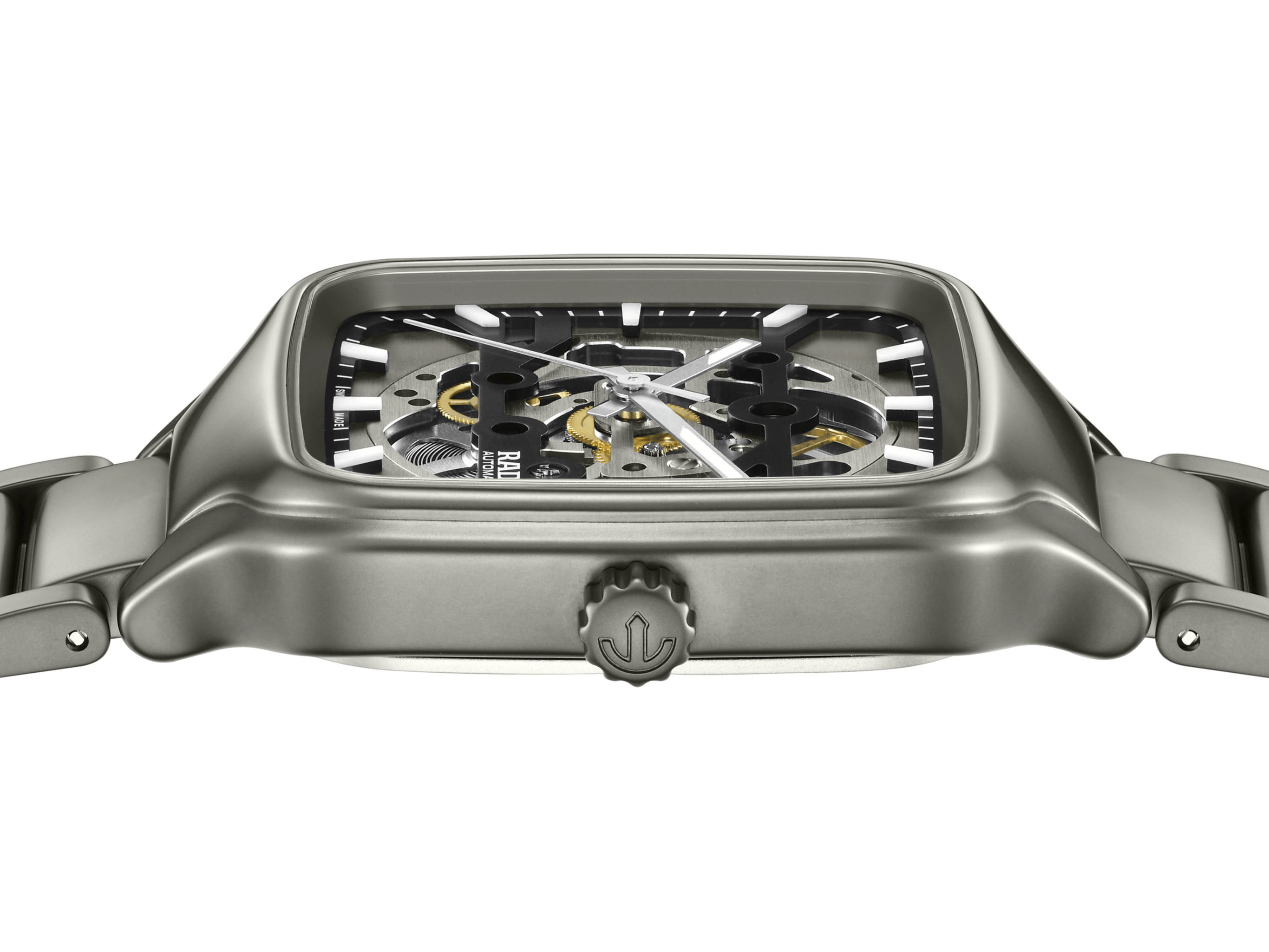 The Rado True Square Skeleton unites complex high-tech materials and ultra fine craftsmanship. Housed in a 38 mm matte plasma high-tech ceramic monobloc case, the R808 skeleton movement is equipped with 25 jewels and offers an 80-hour power reserve. Rigorously tested in five positions, it features an antimagnetic Nivachron™ hairspring and horizontal brushed decorations on the dial side, making this movement a pure demonstration of the Swiss legacy in high-precision engineering.