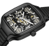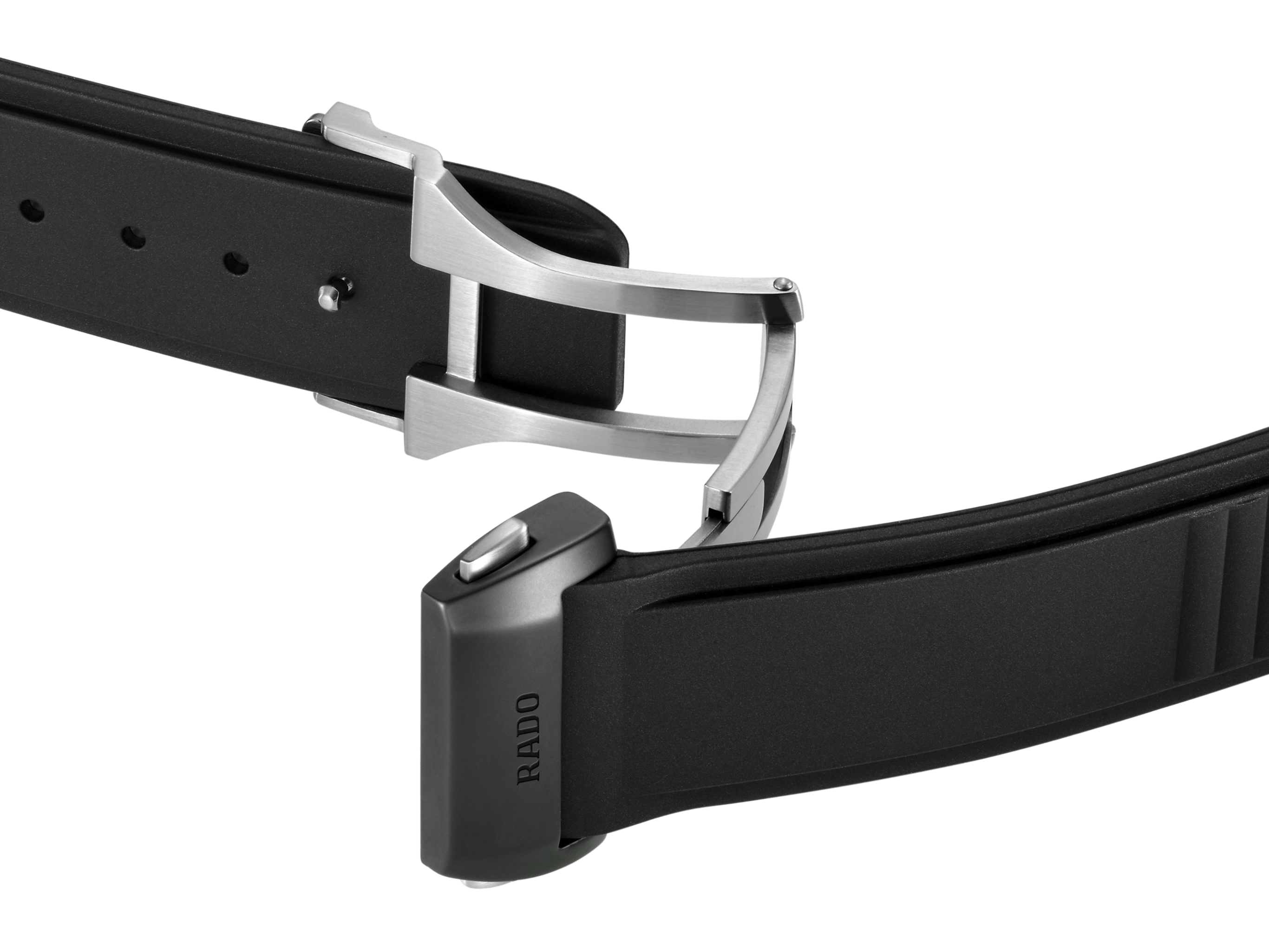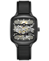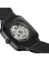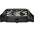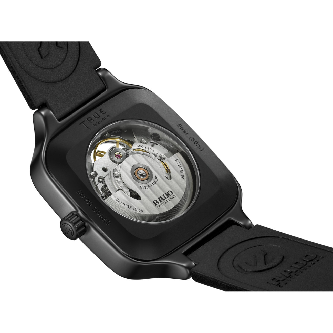 The Rado True Square Skeleton unites complex high-tech materials and ultra fine craftsmanship. Housed in a 38 mm matte black high-tech ceramic monobloc case, the R808 skeleton movement is equipped with 25 jewels and offers an 80-hour power reserve. Rigorously tested in five positions, it features an antimagnetic Nivachron™ hairspring and horizontal Côtes de Genève decorations on the dial side, making this movement a pure demonstration of the Swiss legacy in high-precision engineering. Crowned by a flat sapphire crystal, the dial is a symphony of layered craftsmanship.